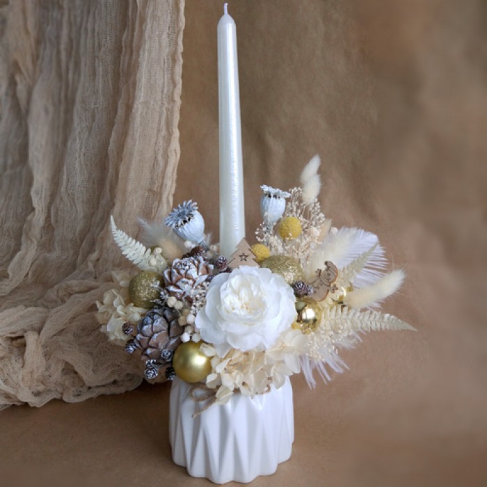 ✿Подсвечник из стабилизированных цветов и сухоцветов со свечей. ✓Неувядающие, вечные цветы сохраняются в натуральном виде от 1 года до 5 лет. ✓Просты в уходе. Не нужно воды, света, прохлады. ✓Они полностью безопасны для людей и животных, почти не имеют запаха и гипоаллергенные. ✓Подойдет для подарка, для украшения мероприятия и декора интерьера дома или офиса. ✓Не боятся мороза. Высота 32см * Ширина 22см Состав: Стабилизированные цветы Сухоцветы Игрушки Шишки Свеча Керамическая ваза